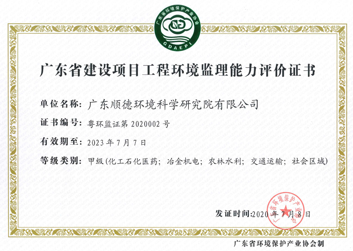 廣東省建設(shè)項目工程環(huán)境監(jiān)理能力評價證書