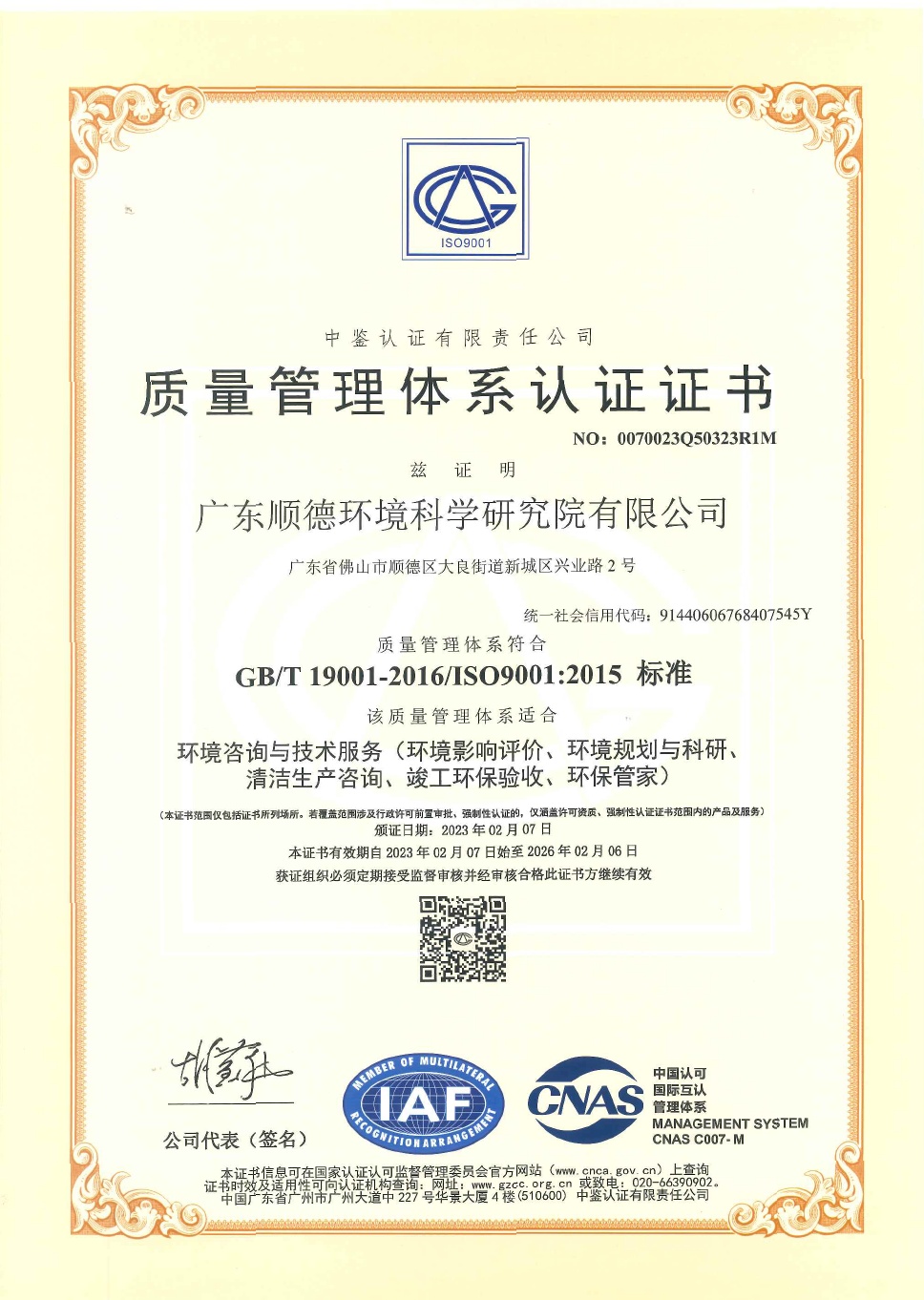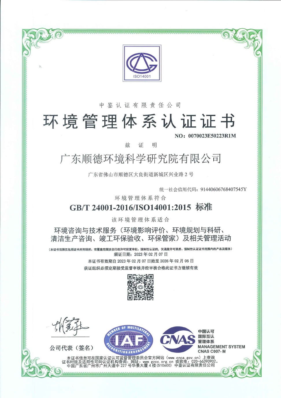 ISO14001環(huán)境管理體系認(rèn)證證書
