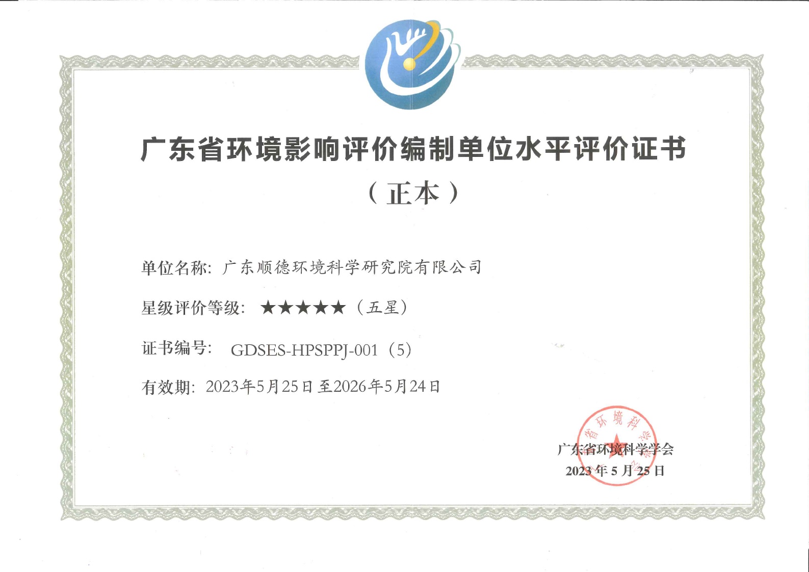 廣東省環(huán)境影響評價編制單位水平評價五星單位證書